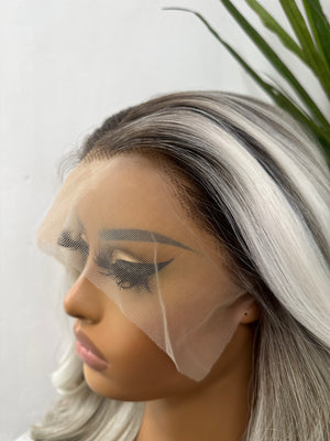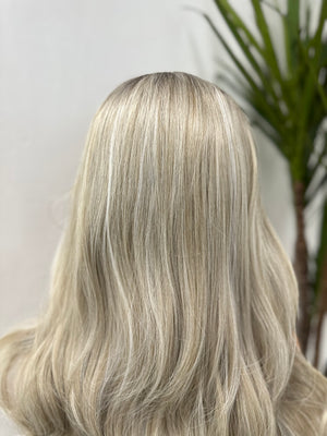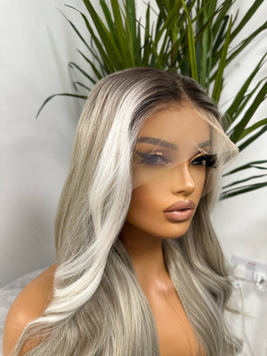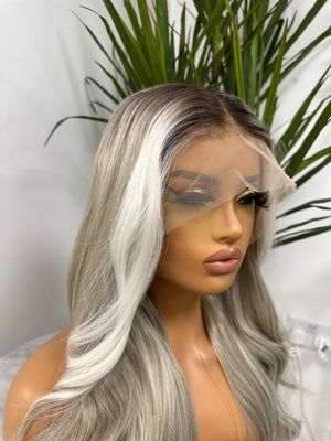Long Layered Rooted Rich Ash Blonde with White Platinum Blonde Face Framing Highlight Synthetic Lace Frontal Wig