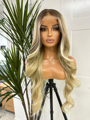 Long Layered Rooted Rich Golden Blonde with White Platinum Blonde/ Brown Lowlight  Face Framing Highlight Synthetic Lace Frontal Wig
