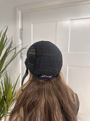 The Long Rooted Rich Brown Ash Blonde Mix Luxe Waves Headband Wig from Estelle Wigs & More blends deep brunette roots with subtle ash-blonde tones for a natural yet dimensional look. With soft, layered waves and a secure headband design, this wig is stylish, lightweight, and easy to wear – no glue or lace needed.