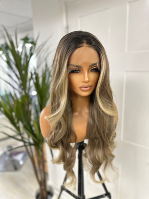 Rooted Brown Blonde Mix Long Synthetic Lace Front Wig-DULCE