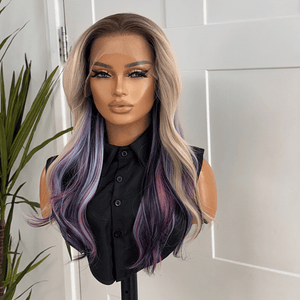 Soft, celestial, and effortlessly radiant — meet Elara, a 22-inch lace front wig inspired by the shimmer of starlight. Flowing in soft waves, Elara blends cool ash-blonde roots with ribbons of lavender, violet, and pastel blue, creating a luminous, multidimensional finish that feels both dreamy and modern.