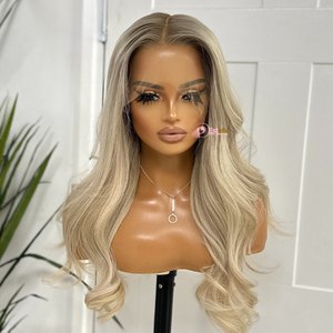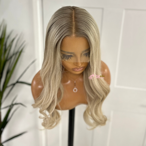 Découvrez KAYLA, une extension blond cendré/blond clair aux racines douces et sophistiquées, offrant une brillance digne d'un salon de coiffure et un volume naturel. Composée à 100 % de cheveux humains, KAYLA se fond parfaitement avec une lace frontale transparente HD 13×6 et se coiffe comme vos propres cheveux.