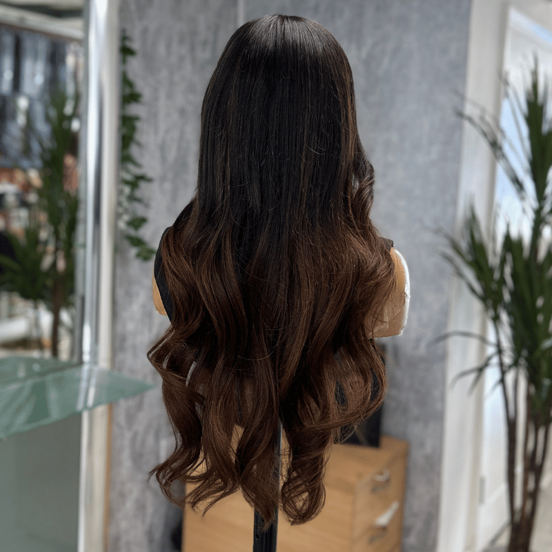 Tamara features a rich brunette base with subtle warm undertones that catch the light beautifully. The depth at the root creates realism and dimension, while the mid-lengths and ends soften into a glossy mocha-chestnut blend. It’s warm without appearing red, rich without looking dull.